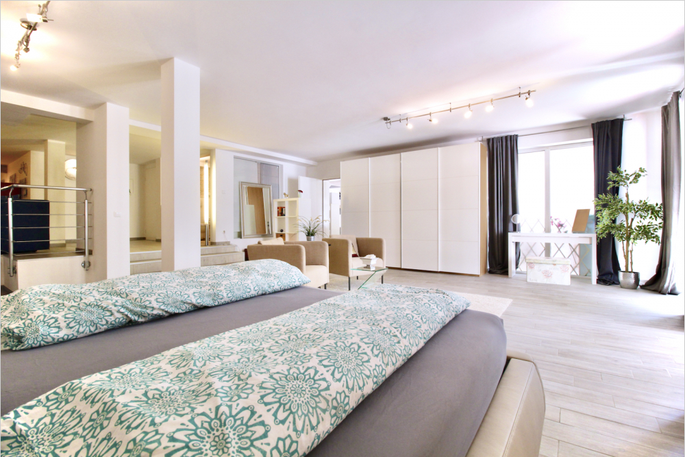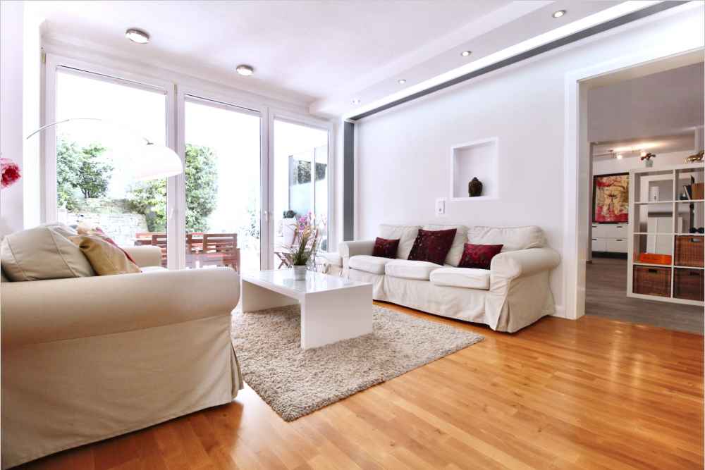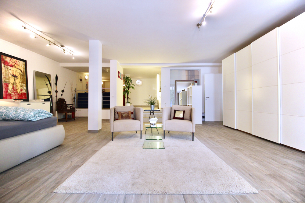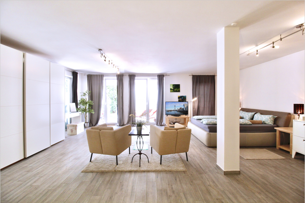 Komplett Möbliert/Furnished Accommodation in: Niederkassel. Haus im Haus in Splitlevel Bauweise, in unmittelbarer Rheinnähe, mit mediteranem Garten, Einzelgarage + Stellplatz. 3 Schlafzimmer, 2 Bäder + Gästetoilette. Dieses großzügige Objekt besticht durch seine geschickte Aufteilung über mehrere Ebenen mit moderner Ausstattung. EG: Offener großer Küchenbereich mit Essplatz. Die Küche ist voll ausgestattet mit Spülmaschine, Waschmaschine, Induktionsherd und Mikrowelle. Wenige Stufen führen hinunter zum großen Wohnbereich (mit multifunktionaler Medienwand mit Subwoofer über Iphone steuerbar) ; (Internet / wlan optional buchbar f. 35 €) mit Zugang zum Garten. Ein Schlafzimmer und ein Gäste-WC befinden sich ebenso im EG. In der oberen Etage befindet sich ein weiteres Schlafzimmer mit Ankleidezimmer und einem weiteren großen Balkon, der Blick in den Garten bietet. Hochwertiges Badezimmer mit Wanne. Ein Garagenstellplatz gehört zur Wohnung. In jedem Schlafzimmer befindet sich ein Flachblidschirm. Das Bürozentrum Am Seestern befindet sich nur wenige Gehminuten entfernt, so auch die Bushaltetestelle in Richtung Innenstadt. Ca. 5 Minuten entfernt fangen die ausgedehnten Rheinauen an, die zu stundenlangen Spaziergängen oder zum Joggen einladen. Auch das beliebte Freibad Lörick befindet sich dort. Auf der Luegallee findet man alle Geschäfte für den täglichen Bedarf und ein weit gefächertes Gastronomieangebot in der Umgebung. Direkter Anschluss zur Messe und Flughafen. EnEv: Bedarfsausweis; Bj.1990,70kWh;Erdgas