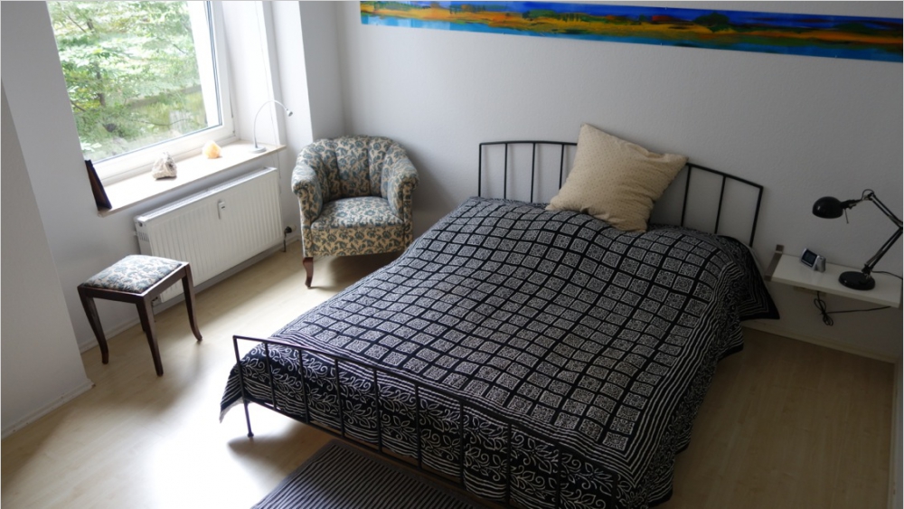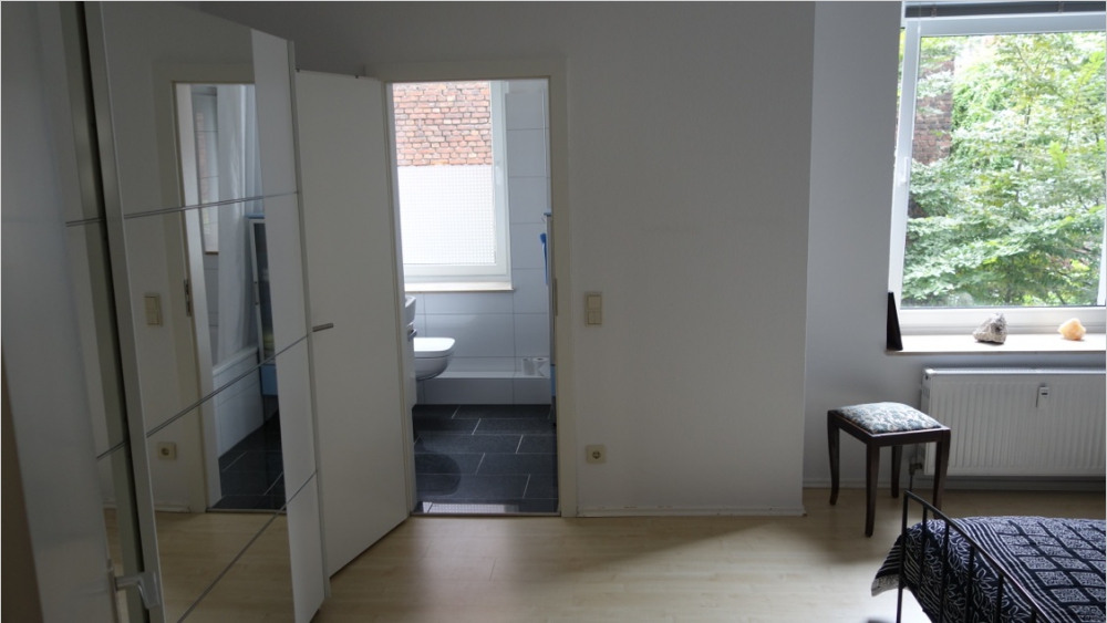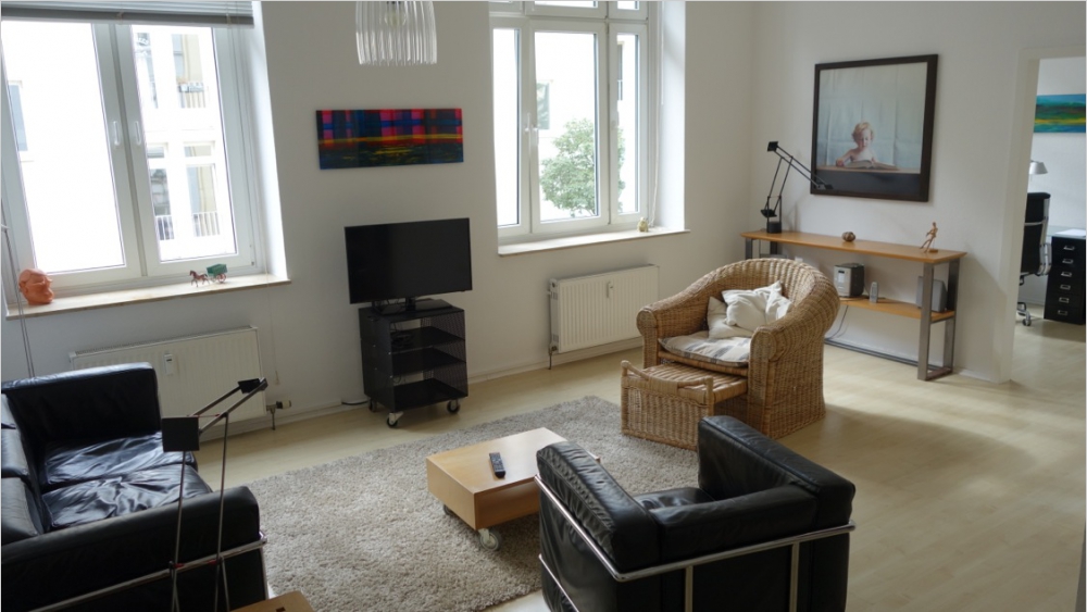 Unterbilk/ Nähe Trendlage Medienhafen: Leben mit Kunst. Gut aufgeteilte 3 Zimmer Wohnung auf 75 Quadratmetern in der ersten Etage, mit Aufzug in saniertem Altbau, mit Parkett und hohen Decken. Wohnzimmer mit Corbusier Sofa/Sessel, Arbeits-Besucherzimmer mit Schlafcouch, Schlafzimmer mit Doppelbett, ruhig,nach hinten gelegen. Wohnküche mit Vollausstattung und Waschmaschine.. Wannen-Duschbad mit Fenster, zusätzliches GästeWC. Die Lorettostraße und Bilker Allee bieten als Einkaufmeilen alle Geschäfte für den täglichen Bedarf, viele gemütliche Restaurants, Cafés und Kneipen. Der Medienhafen liegt in walking distance wie die gesamte Rheinpromenade und die Altstadt. Straßenbahn und S-Bahn-Haltestellen vor der Tür garantieren kurze Wege in die Innenstadt oder zum Flughafen ohne PKW. Eigener WLAN-Anschluss, 120Mbit/S, iTV, Smart TV. Fahrradstellplatz im Keller. Duplex-Garagenstellplatz für 100,- Euro optional anmietbar. Nicht für SUV oder E Auto geeignet.Nichtraucher- Wohnung. Mindestmietzeit 2 Monate. EnEV: Bedarfsausweis, MFH, Baujahr 1890, fossile Brennstoffe/Strom, 129 kwH